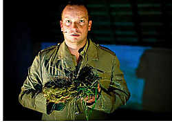 De vertelling begint in de schuur, waar Perceval/Weyns in suppoostenkostuum het verleden bezingt. Hij is de bouwer, ‘op zoek naar hoe het was’. Vanuit de lucht zweeft hij over zijn aanbeden land. Overal zijn gebouwen verdwenen, maar dit is ‘zijn nest’. Hij houdt het zelfs letterlijk in zijn hand.