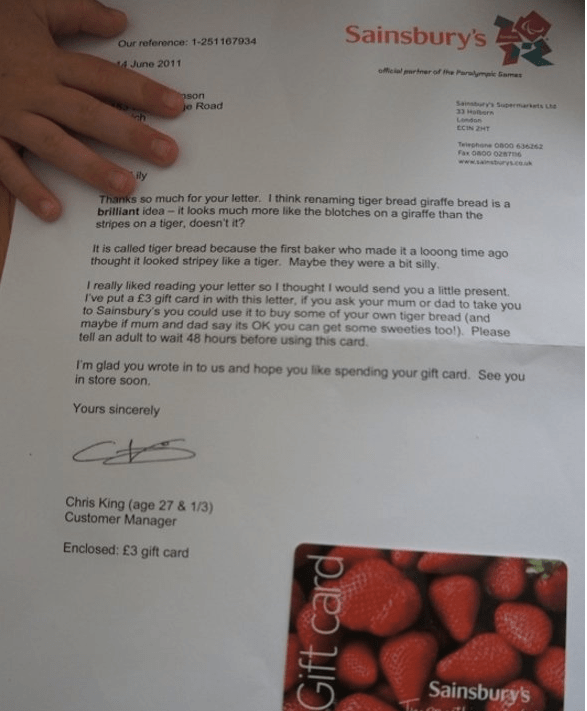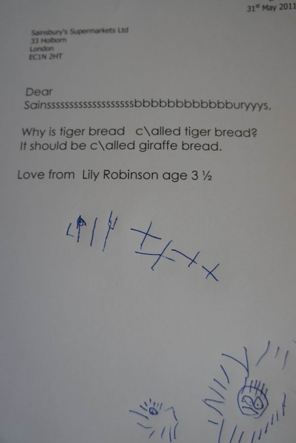 Het driejarige Britse meisje Lily vroeg zich af waarom tijgerbrood eigenlijk tijgerbrood heet. Het motief lijkt immers meer op dat van een giraffe. Ze stuurde de Britse supermarktketen Sainsbury’s een brief en kreeg antwoord.